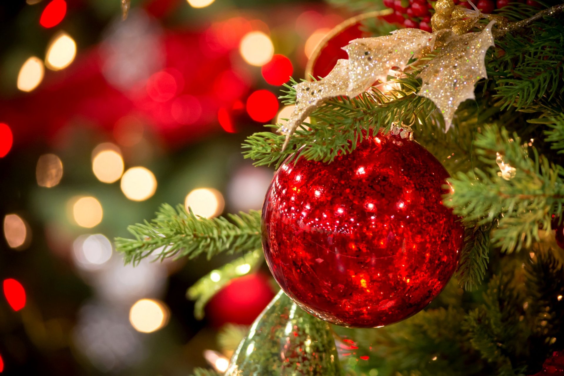 bola rojo juguete árbol de navidad ramas abeto bokeh luces invierno vacaciones año nuevo navidad