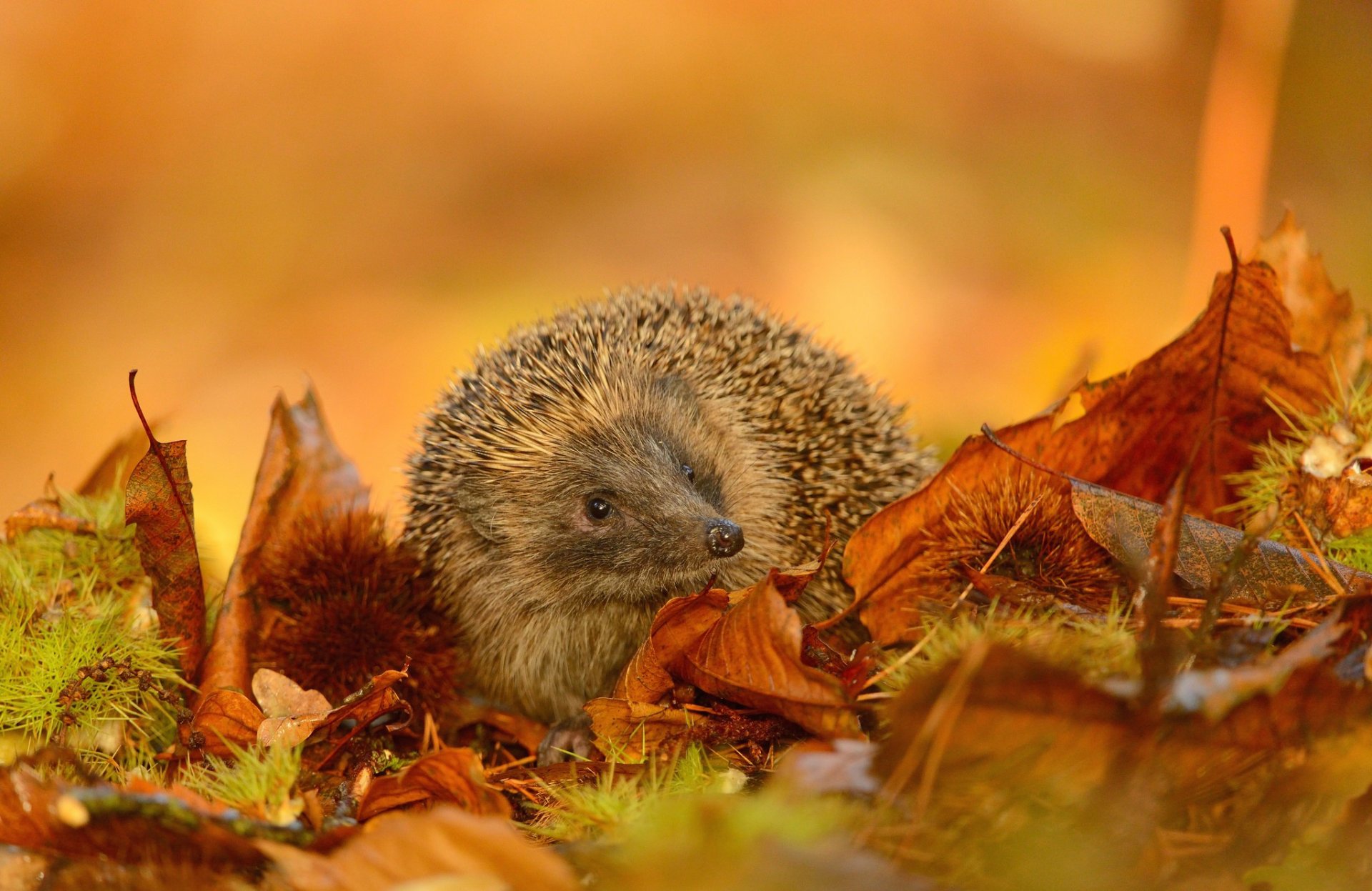 Erizo melancólico. Hojas en el bosque - fondos de Escritorio