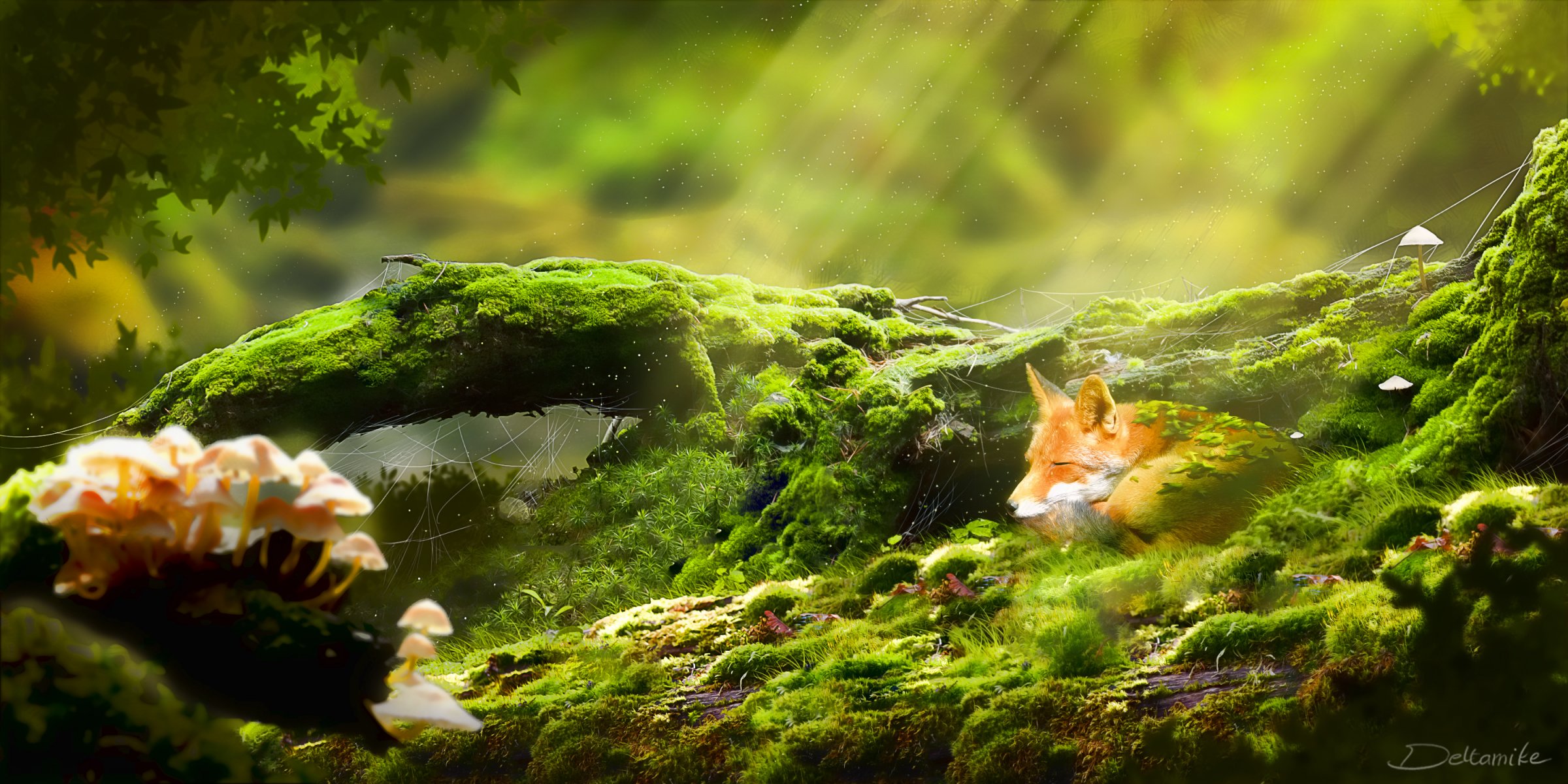 Etiquetas:arte, bosque, hierba, musgo, zorro, zorro, setas, telaraña, tronco, rayos del sol