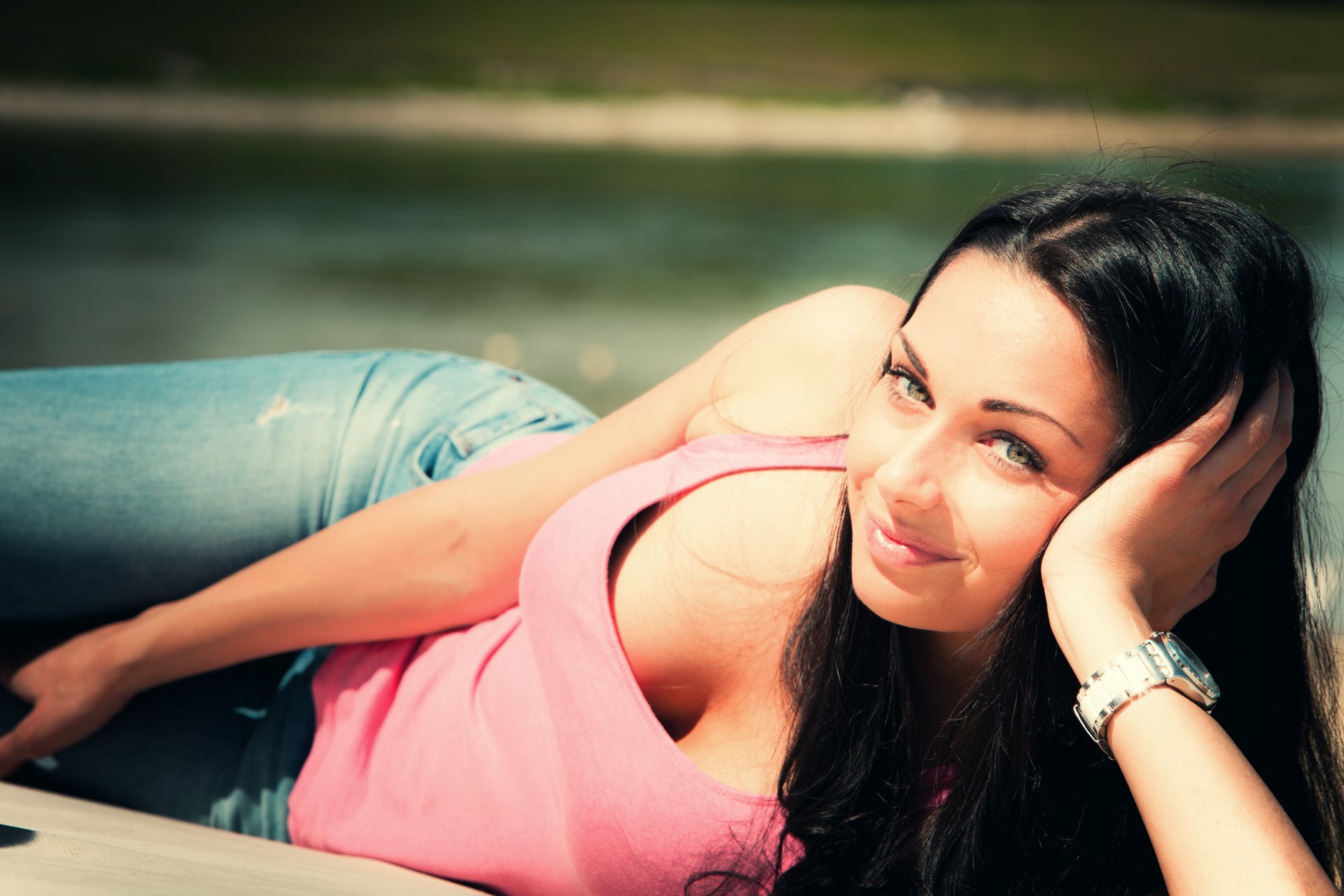 Chica acostada de lado en jeans azules y una camiseta rosa - fondos de pantalla