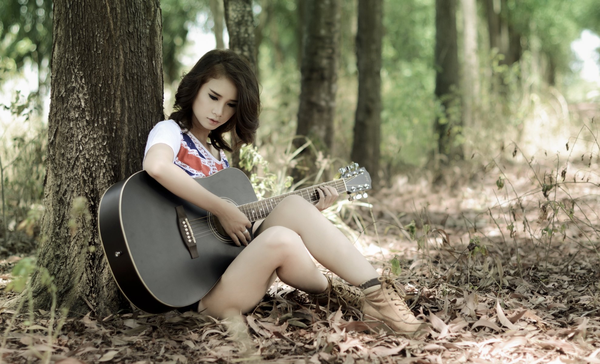 Chica con guitarra bajo un árbol - fondos de pantalla