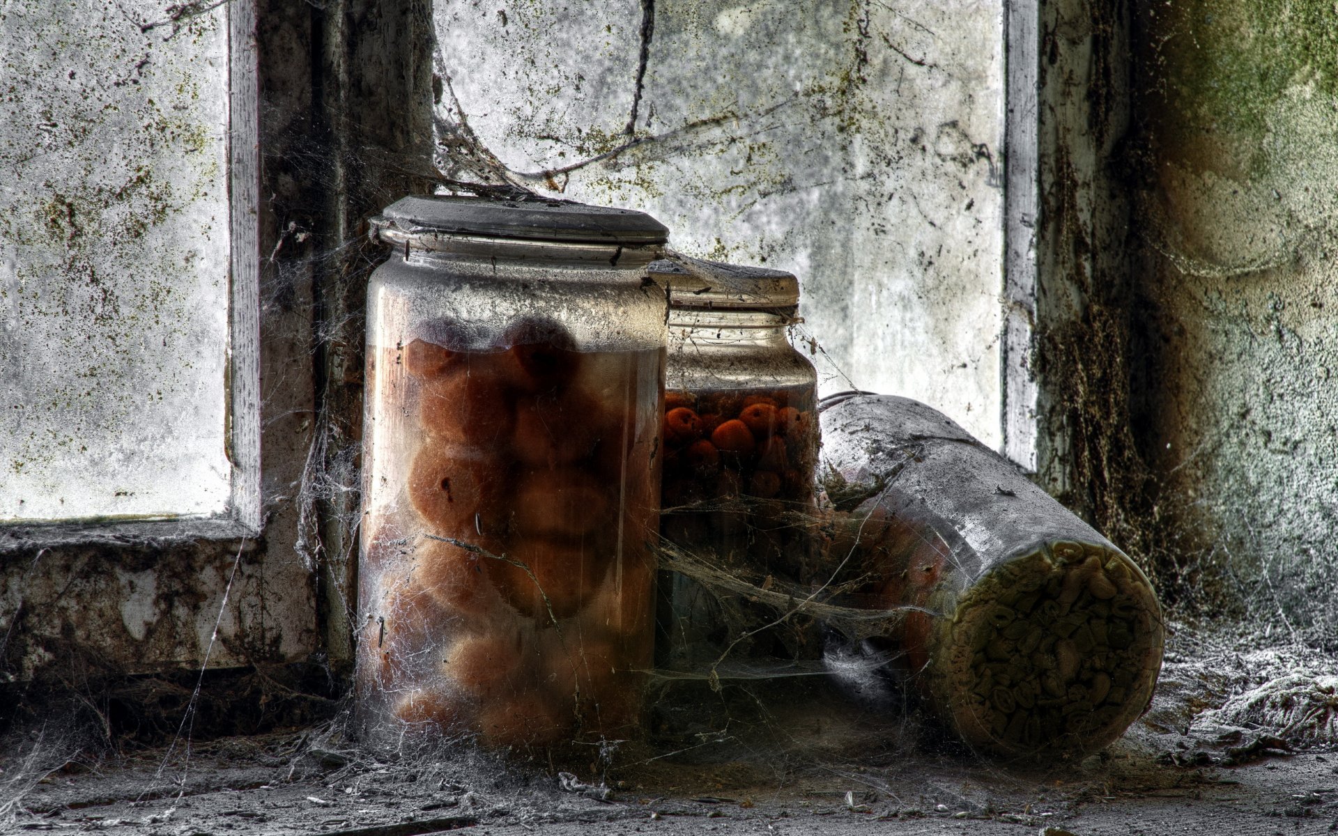 Latas de fruta en una ventana sucia - fondos de Escritorio