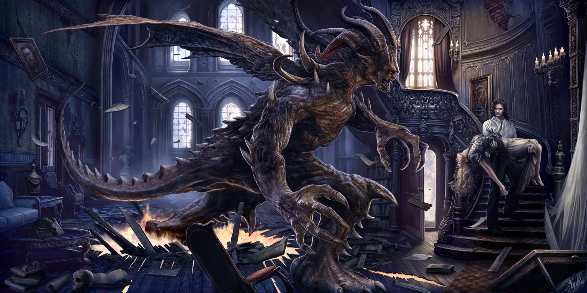 arte casa demonio cuernos alas chico chica escalera víctima escombros