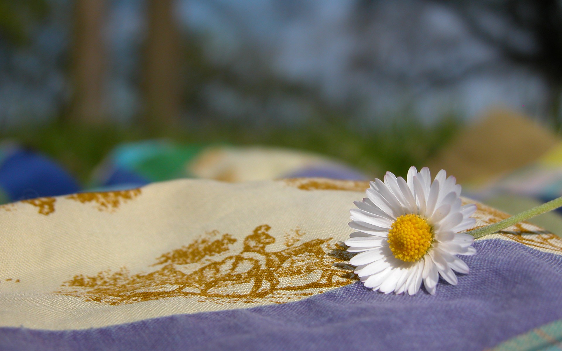 La manzanilla descansa sobre la tela en una fotografía macro - fondos de pantalla