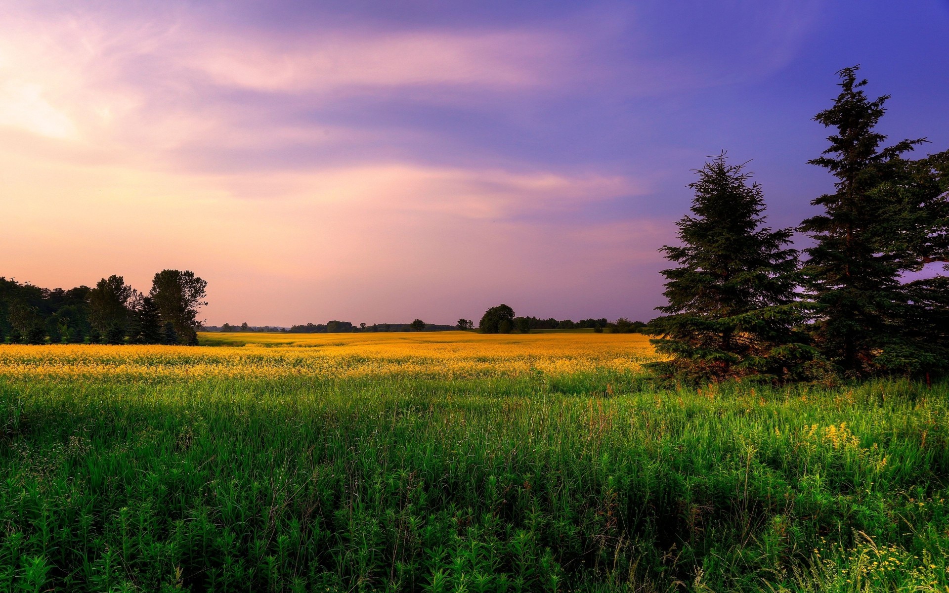 Cielo púrpura y amarillo con Prado verde - fondos de pantalla