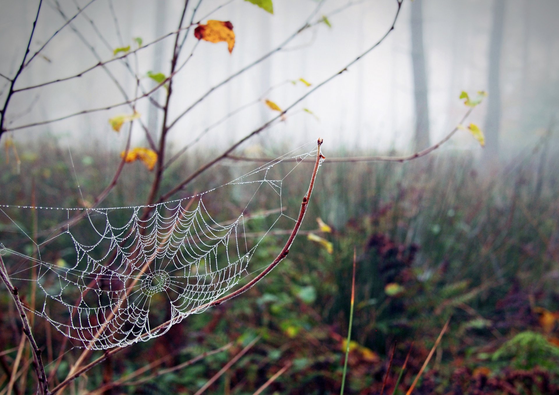 Telarañas en gotas de rocío en el bosque de otoño - fondos de pantalla