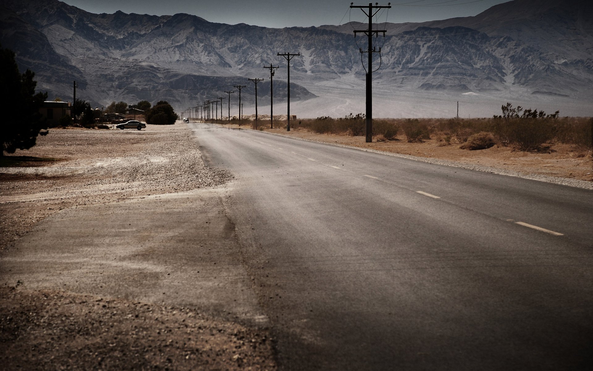 carretera montañas postes gasolinera restaurante coche