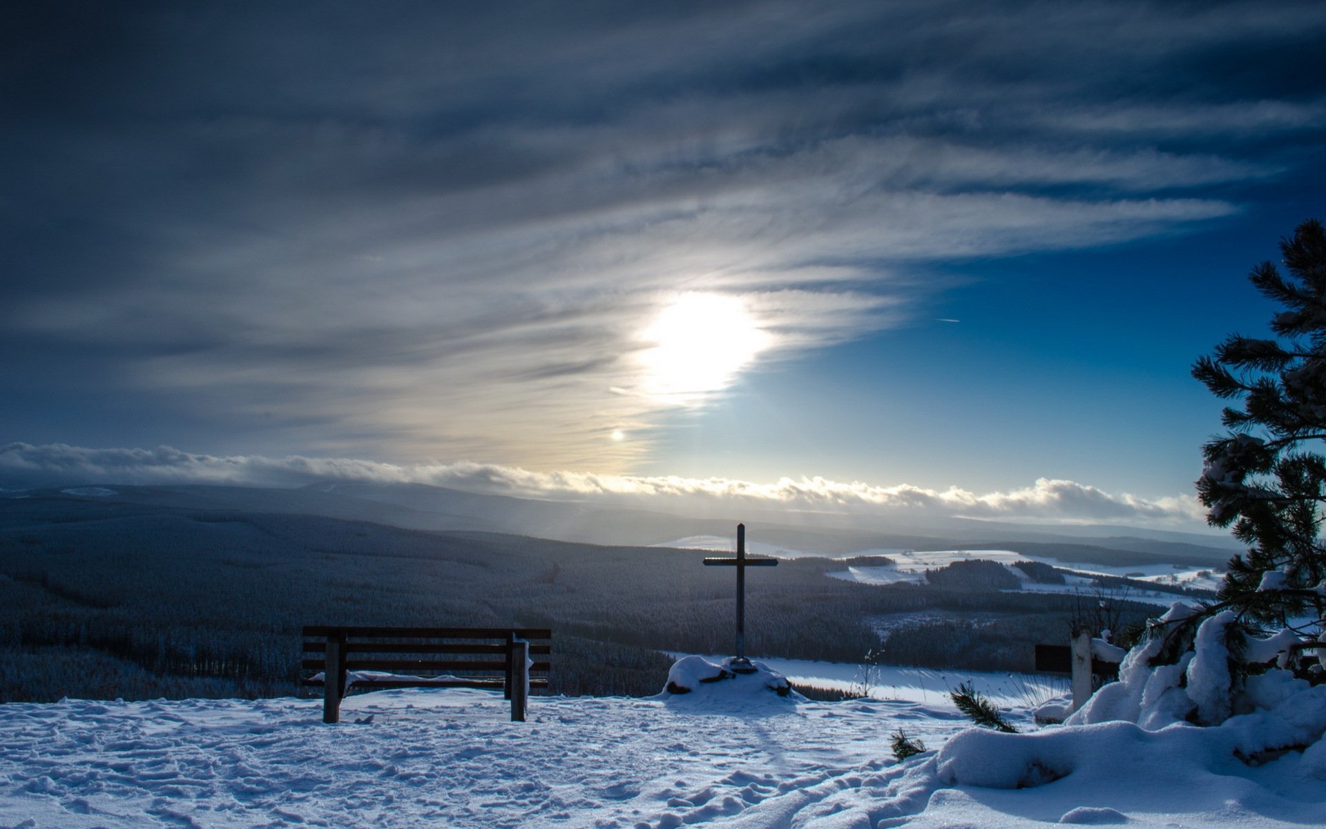 Etiquetas:montañas, banco, cruz, paisaje