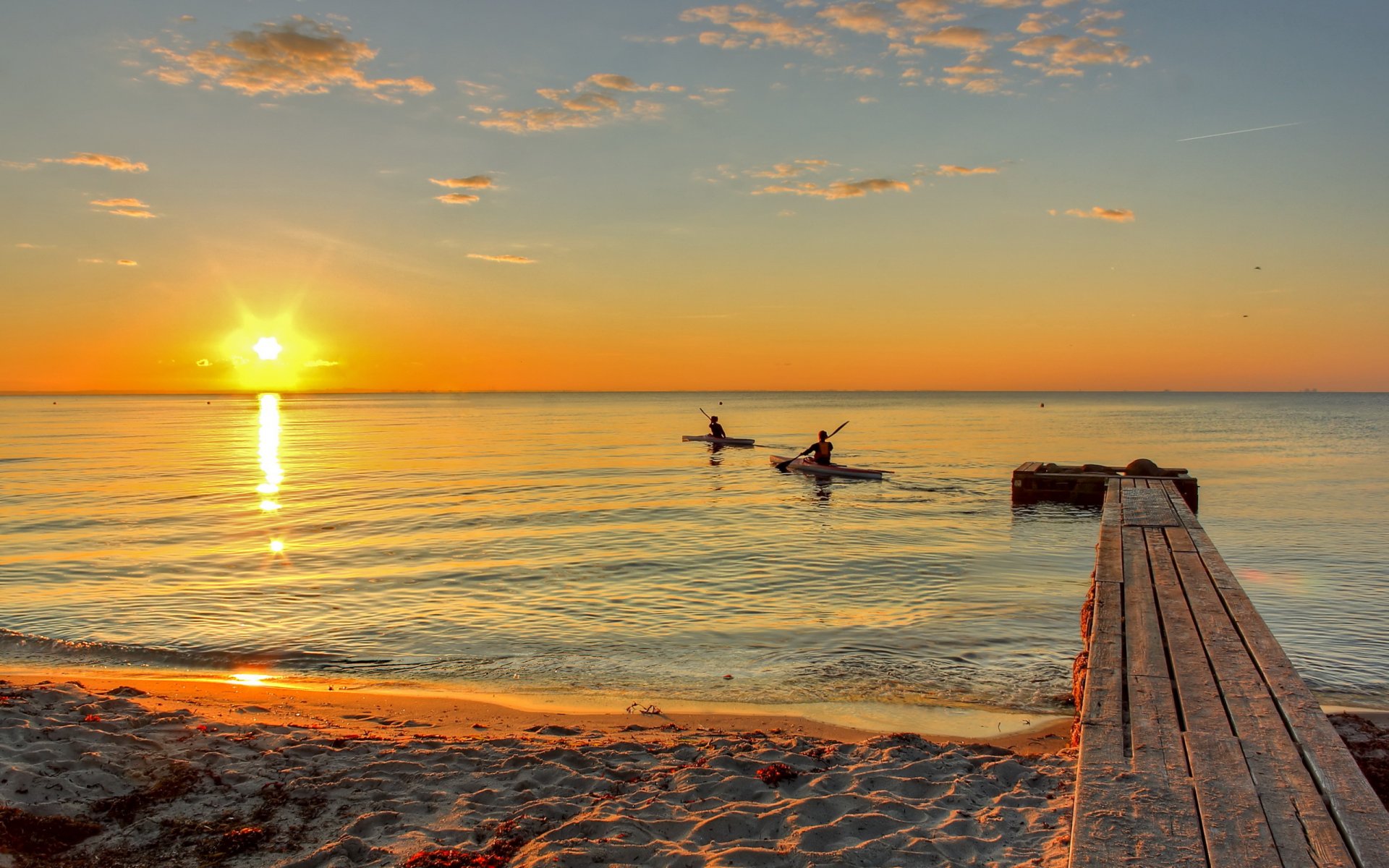 Gente en el mar en botes al atardecer - fondos de pantalla