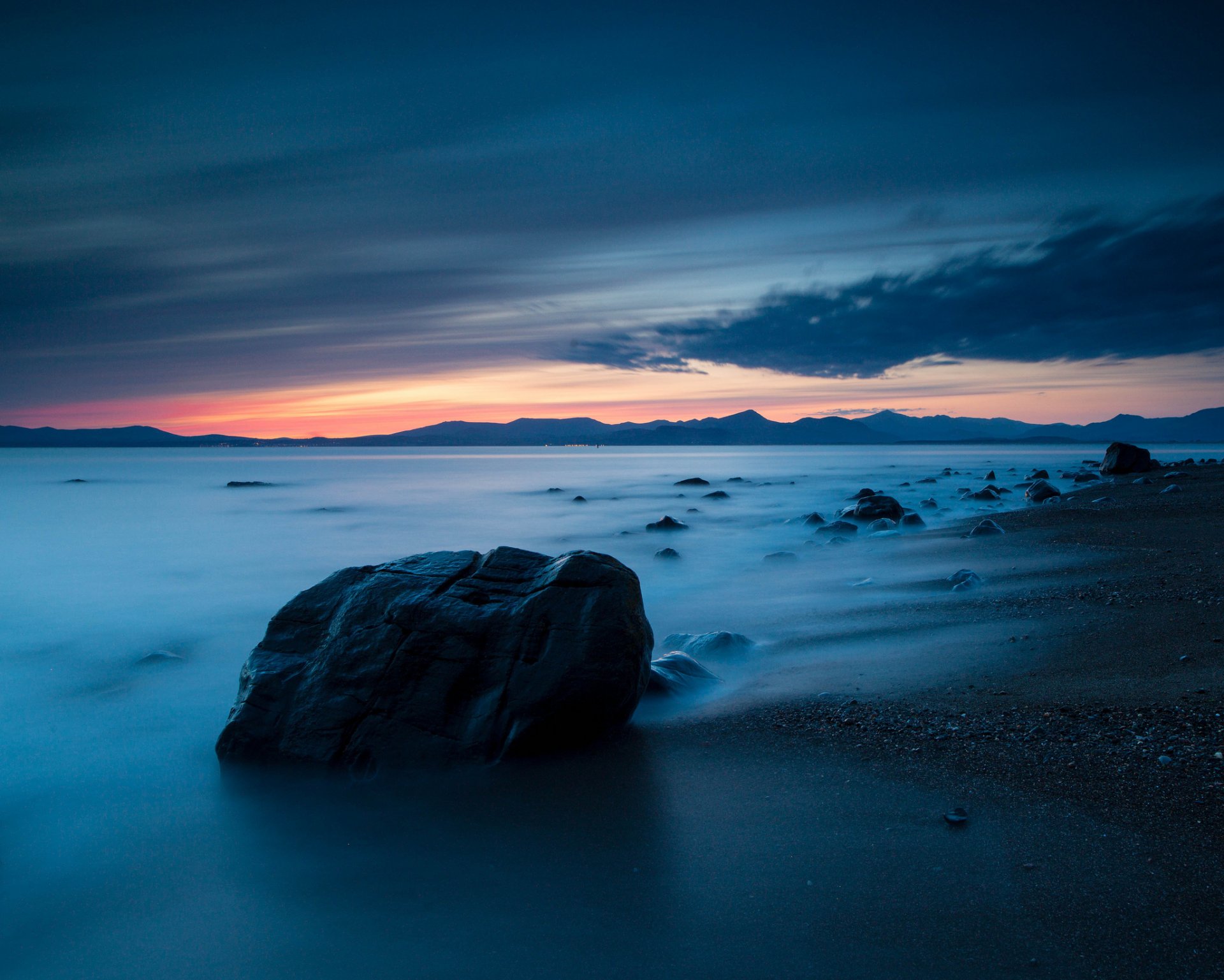 Puesta de sol en el mar. Playa vacía con piedras - fondos de pantalla