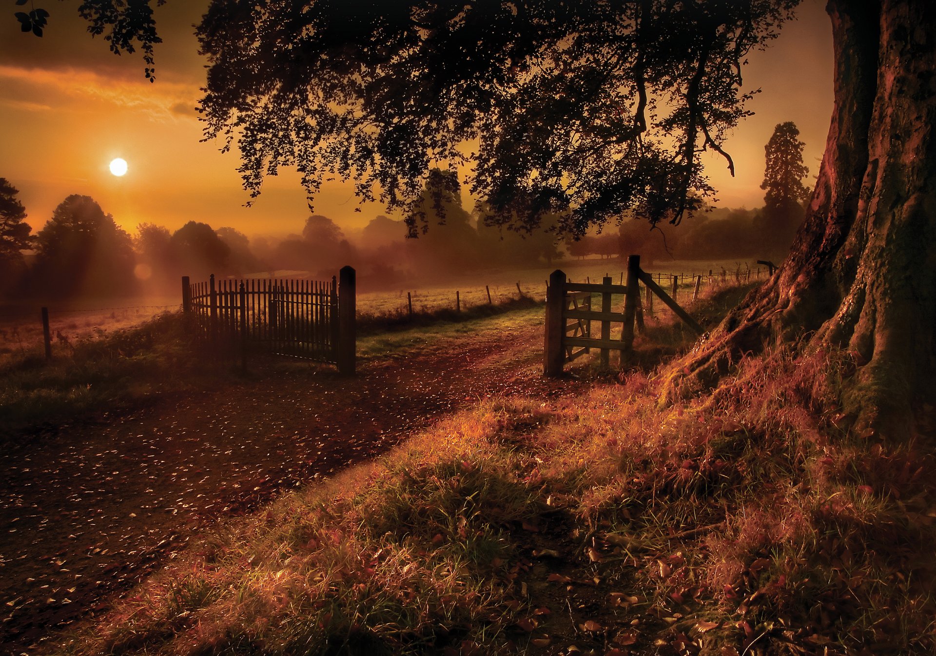 cerca sol árbol árboles hierba ramas hojas tronco tierra niebla cielo rayos resplandor naturaleza