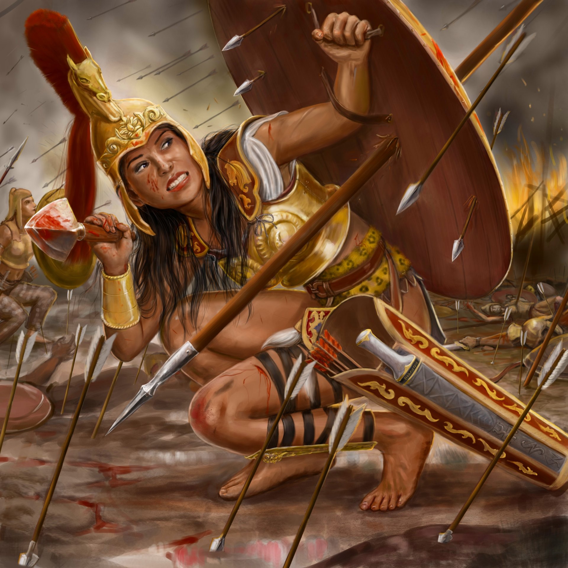 thalestris amazonas chica pintura guerra armadura escudo lanza flechas fuego