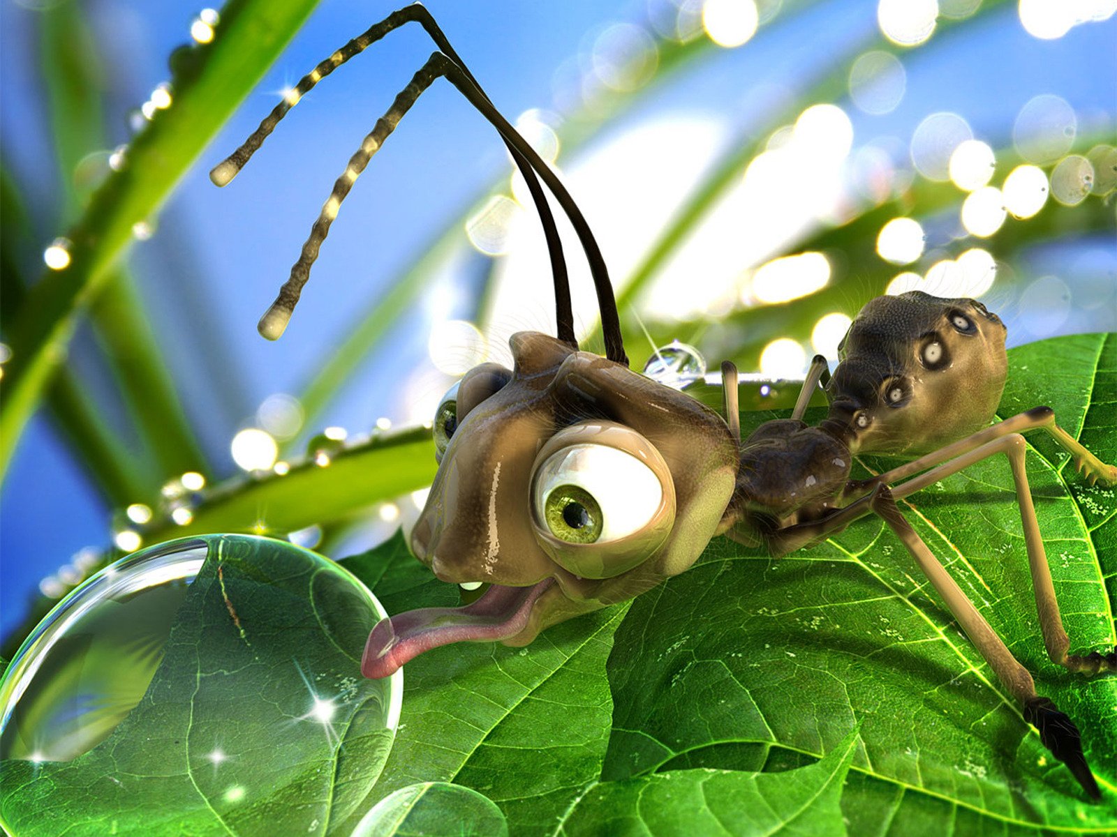 Una hormiga lame una gota de rocío de una hoja - fondos de pantalla