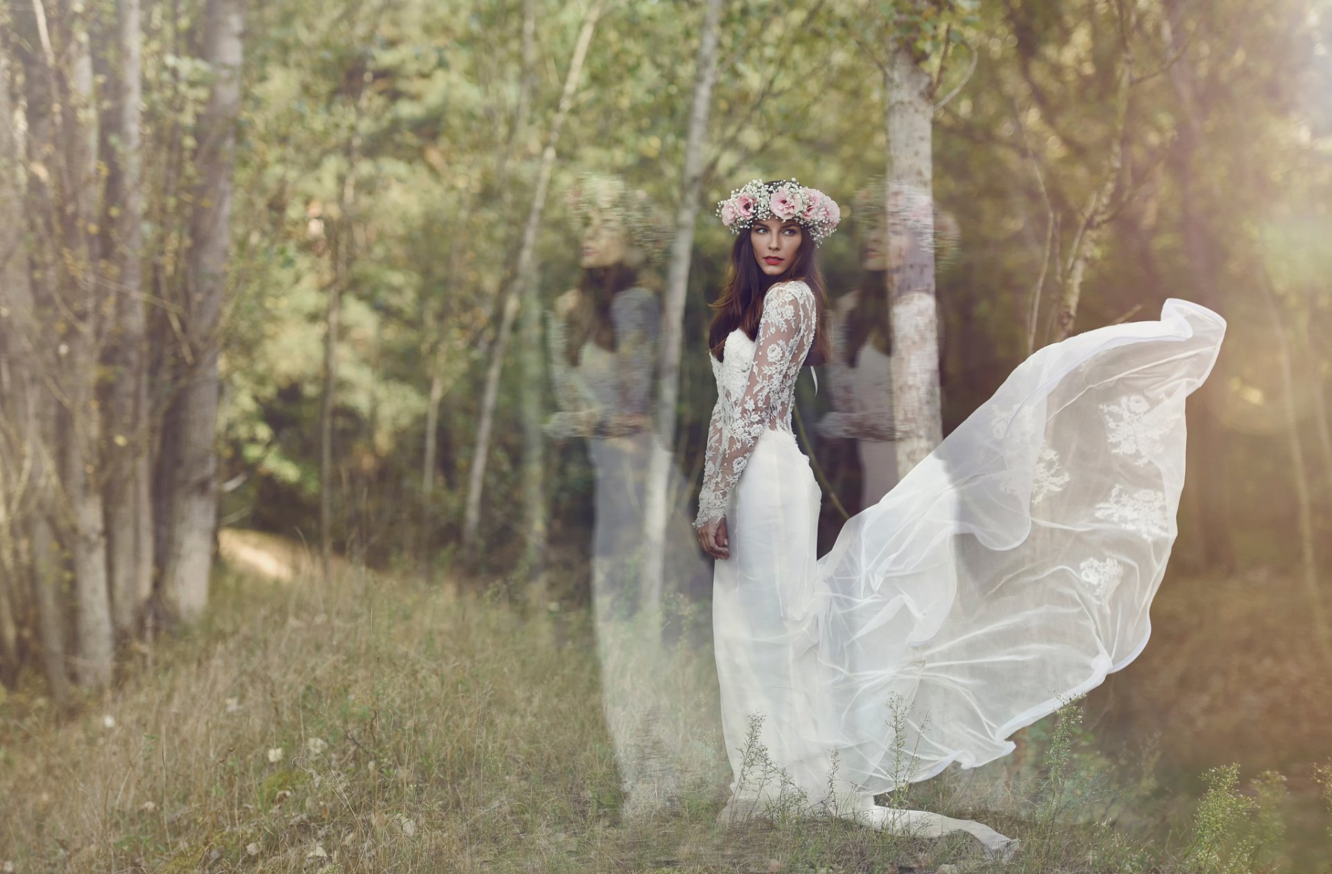 La novia en una corona en el fondo de la naturaleza