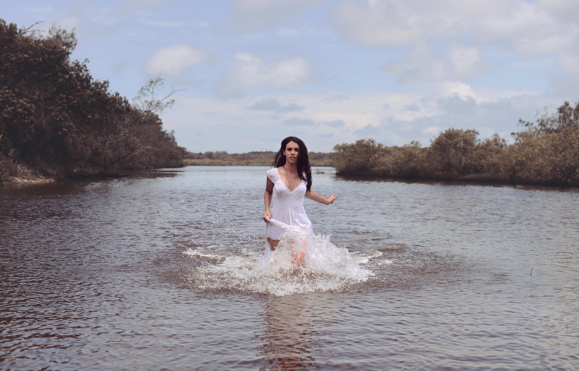 Chica en vestido de negocios crea un chorro en el río - fondos de pantalla
