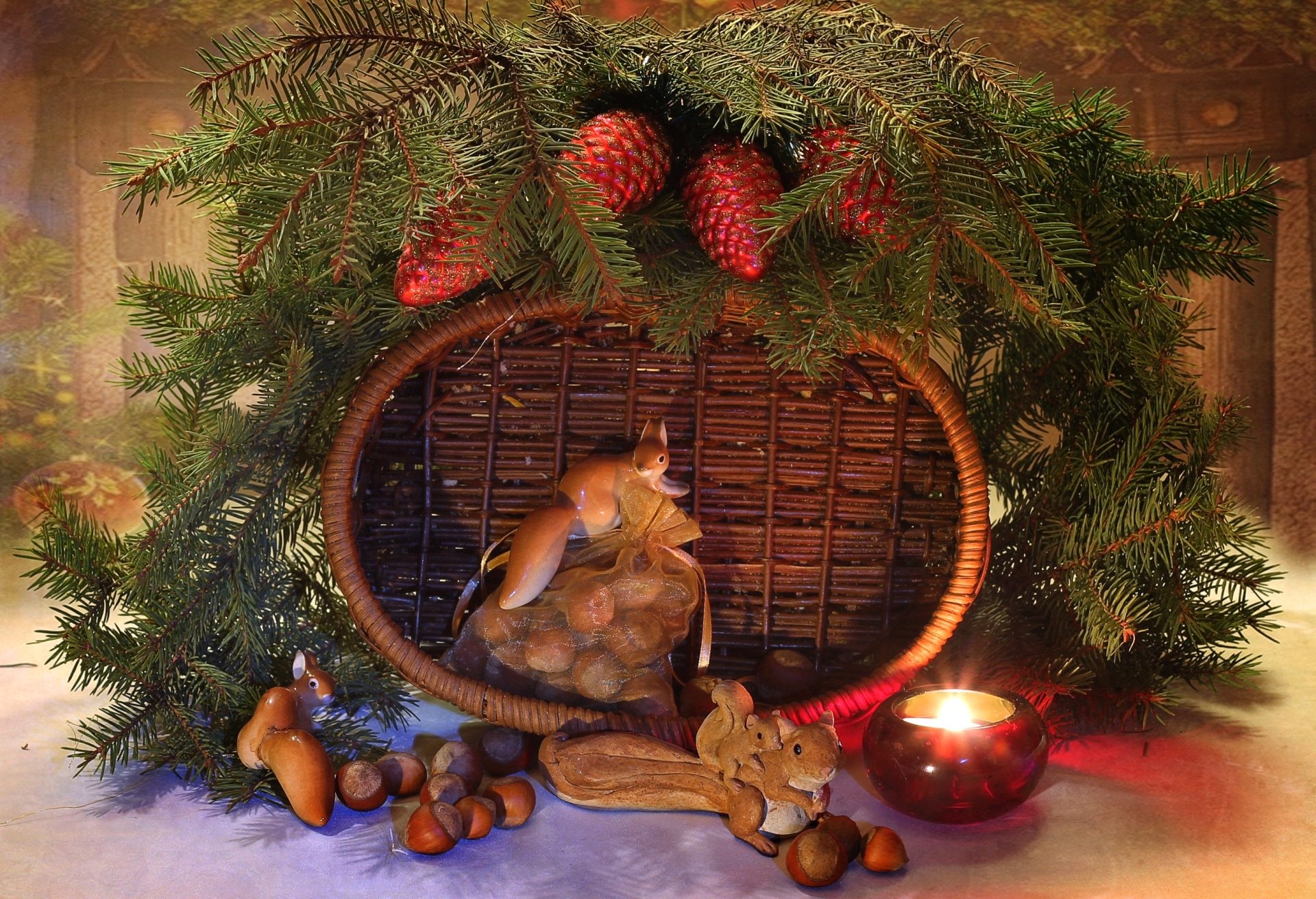 Juguetes interesantes en forma de ardillas, nueces y cestasJuguetes interesantes en forma de ardillas, nueces y cestas