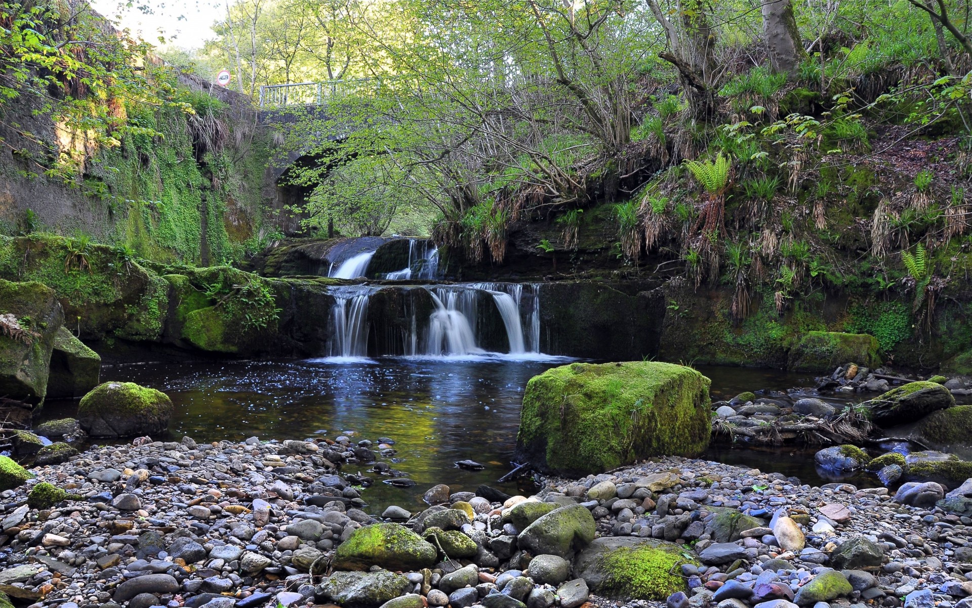 El agua de la cascada se filtra a través de grandes rocasEl agua de la cascada se filtra a través de grandes rocas