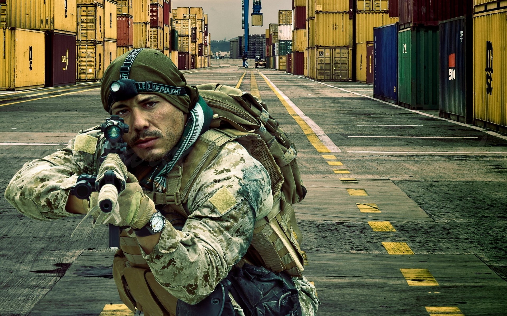 Hombre de piel oscura en un casco con una ametralladoraHombre de piel oscura en un casco con una ametralladora