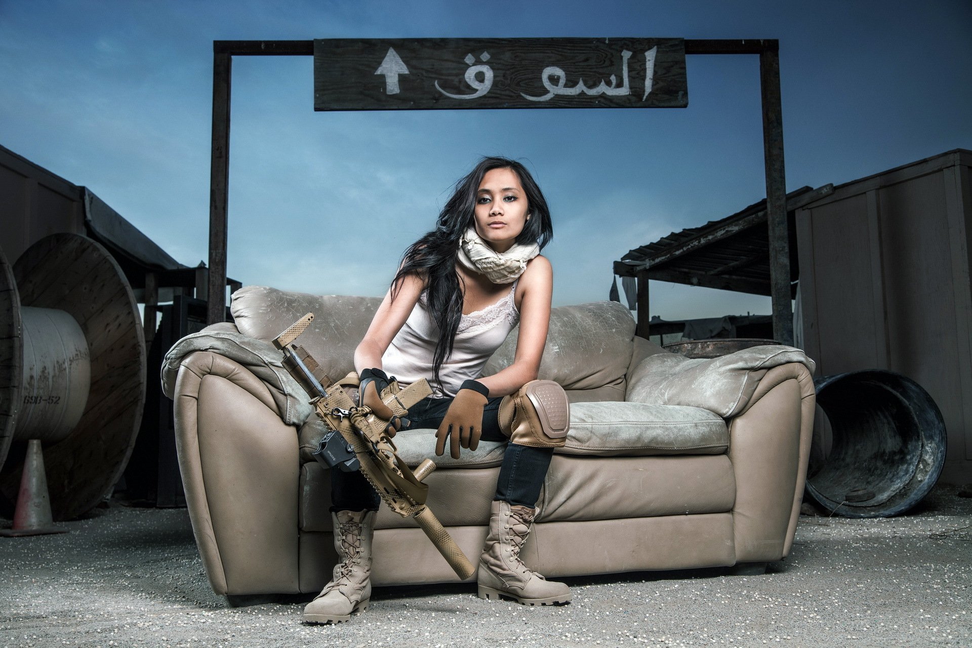 Chica de anime con ametralladora de cañón múltiple