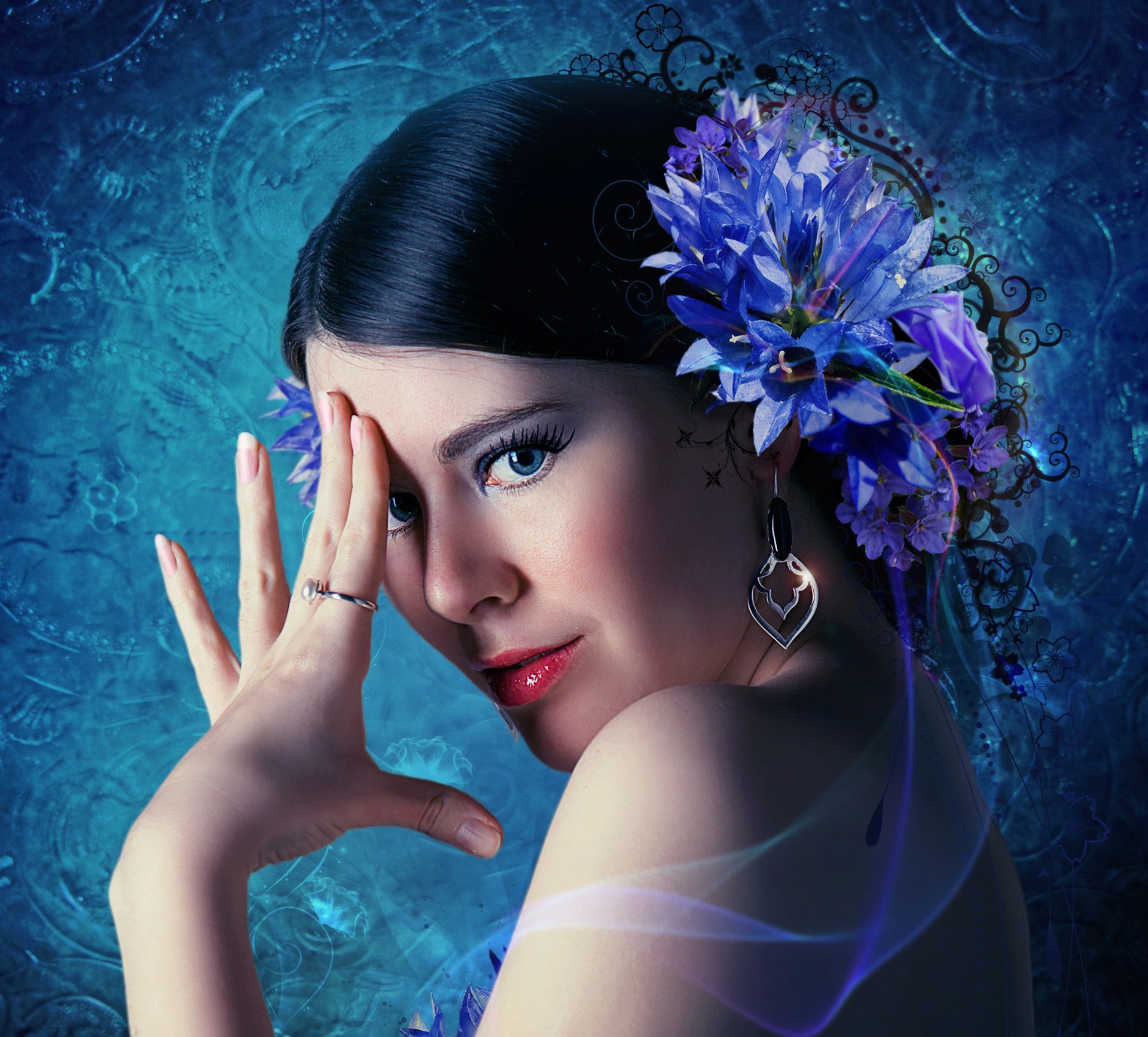 Chica con una escoba de flores de color púrpura en la pinturaChica con una escoba de flores de color púrpura en la pintura