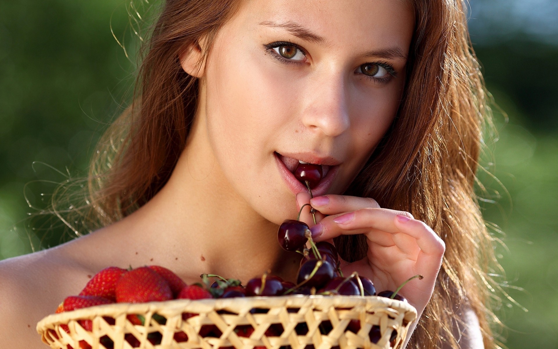 Chica con una cesta de fresas y cerezas en la boca