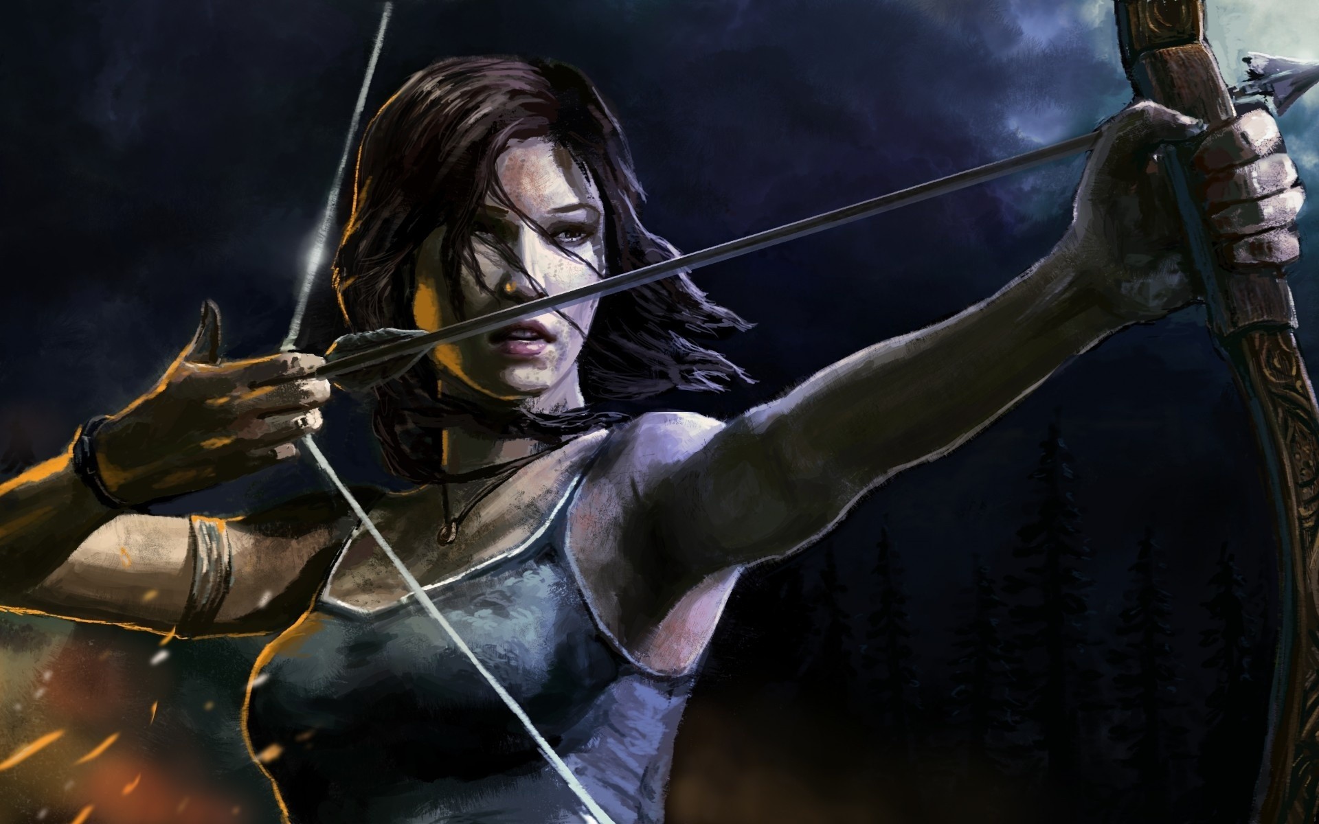 Encantadora lara croft en una escena de tiro con arcoEncantadora Lara Croft en una escena de tiro con arco