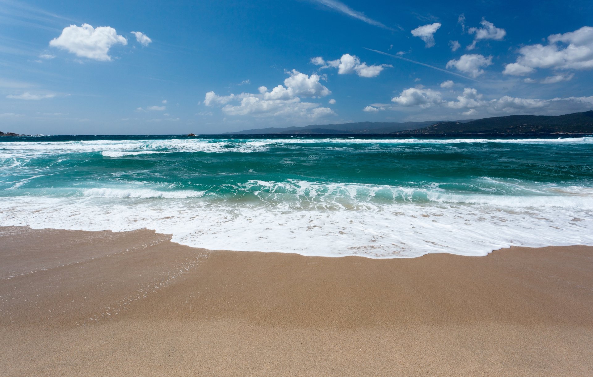 Olas turquesas con tormentas de espuma en la arenaOlas turquesas con tormentas de espuma en la arena
