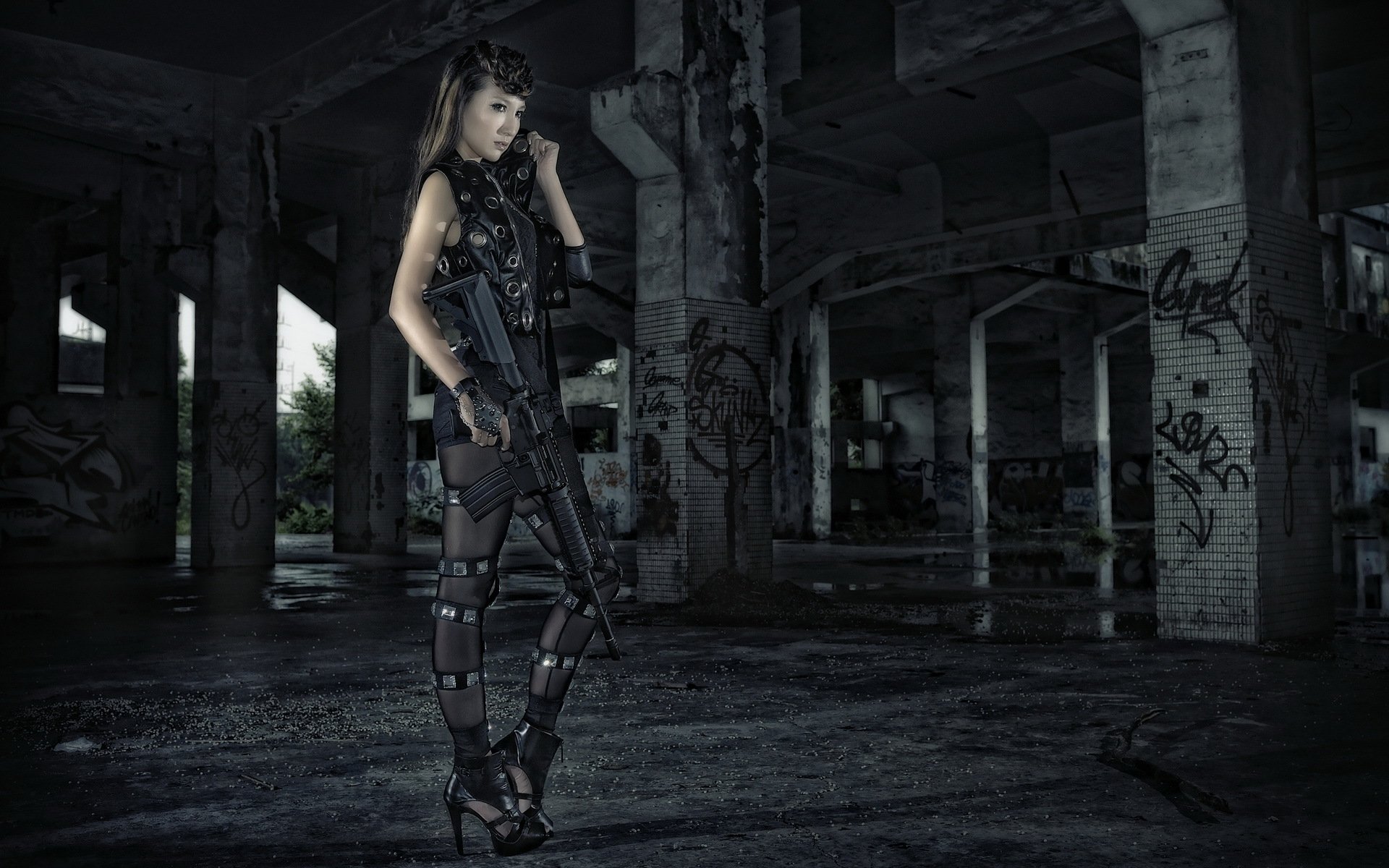 Un soldado con un arma en la mano en el fondo de un edificioUn soldado con un arma en la mano en el fondo de un edificio
