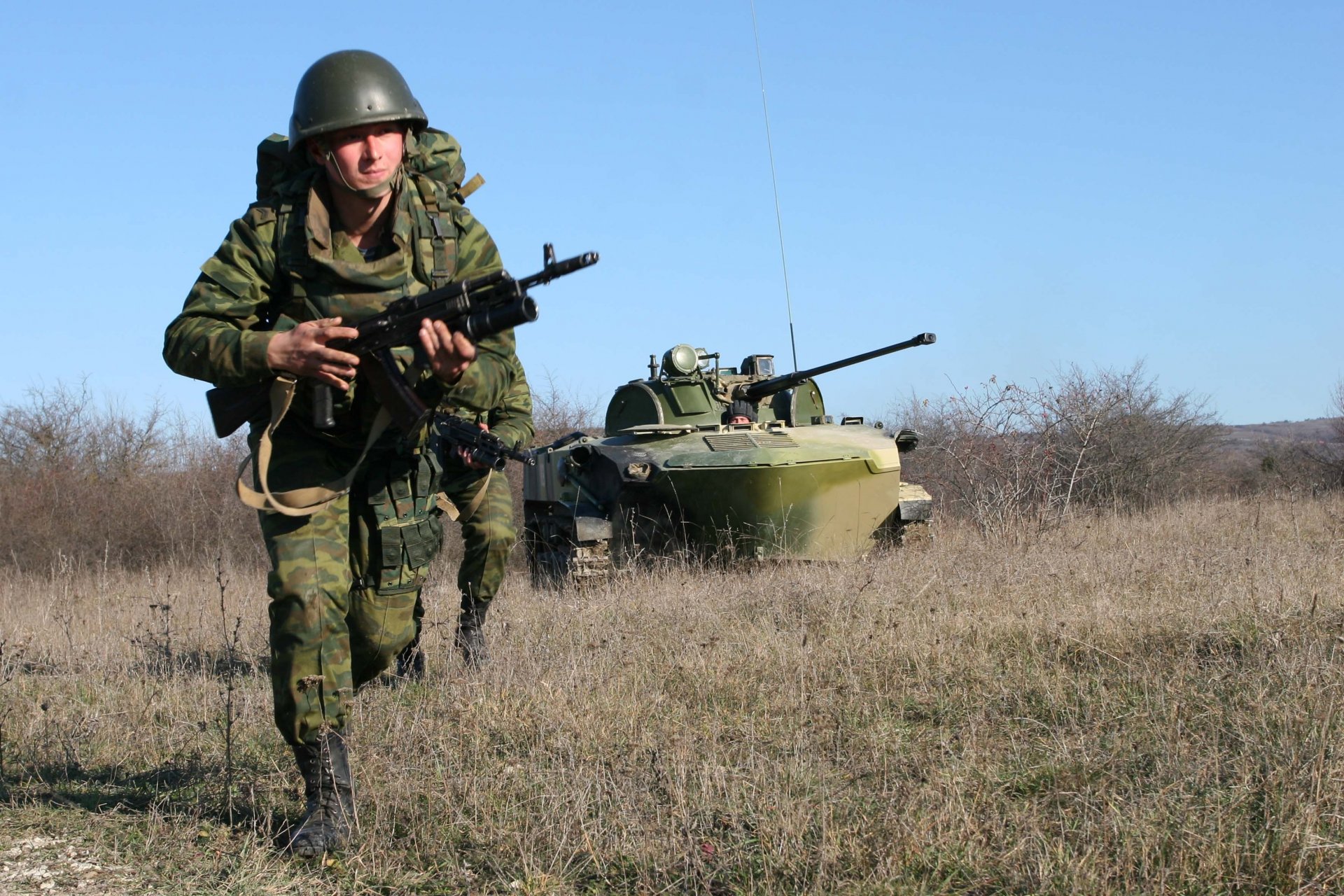Un militar con una ametralladora corre por el campoUn militar con una ametralladora corre por el campo