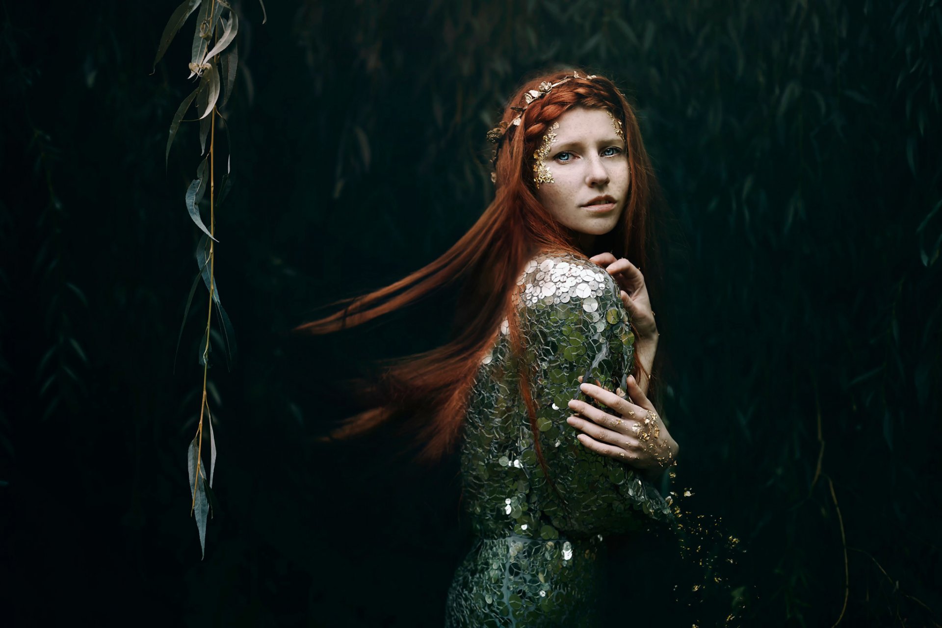 Chica con el pelo largo y blanco y vestido de azufre ena árbolChica con el pelo largo y blanco y vestido de azufre ena árbol