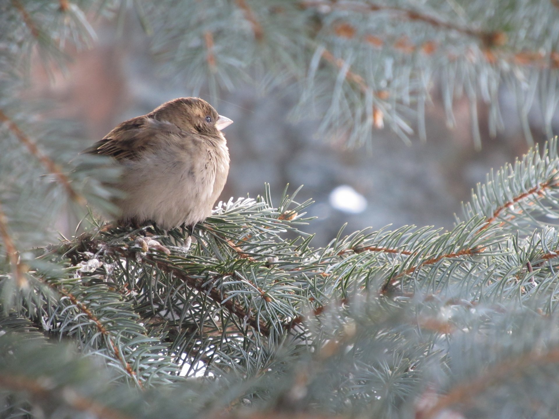 Gorrión en el abeto azul
