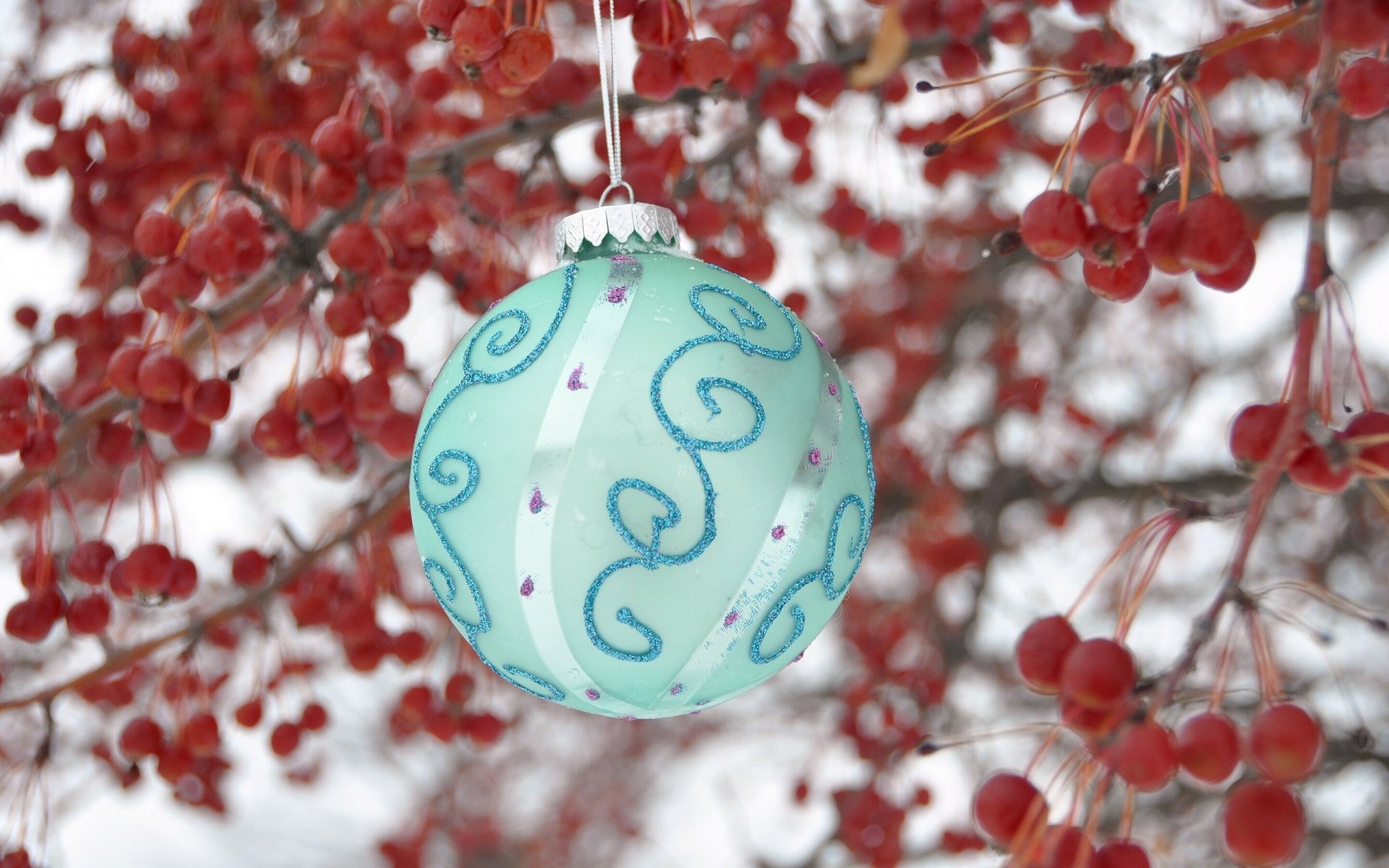 Árbol de navidad, bola turquesa sobre un fondo de bayas rojasÁrbol de Navidad, bola turquesa sobre un fondo de bayas rojas