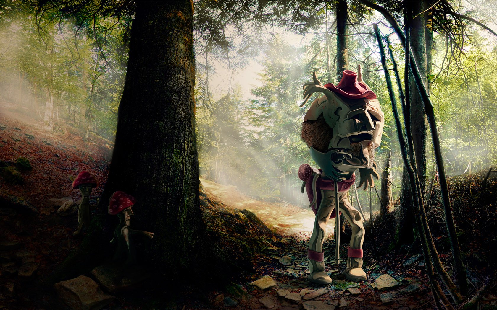 Un monstruo y guardias con arcos observan un barco que navega por el río entre las rocasUn monstruo y guardias con arcos observan un barco que navega por el río entre las rocas