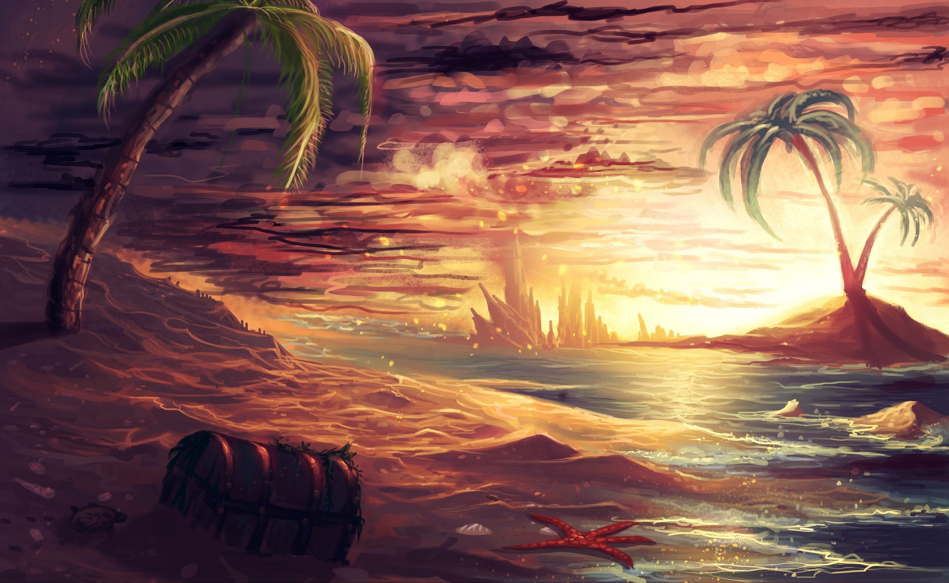 Imagen de una puesta de sol en el mar con un cofre y una palmeraImagen de una puesta de sol en el mar con un cofre y una palmera