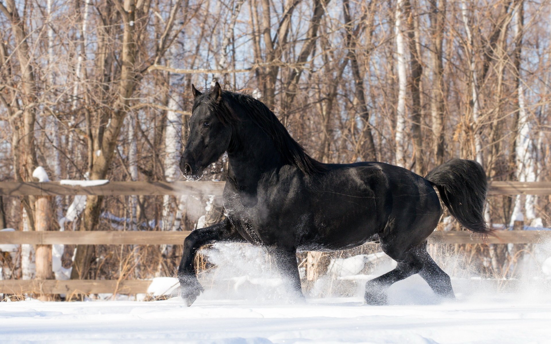Un guerrero lleva a su compañera en un caballo negro en un paisaje invernalUn guerrero lleva a su compañera en un caballo negro en un paisaje invernal