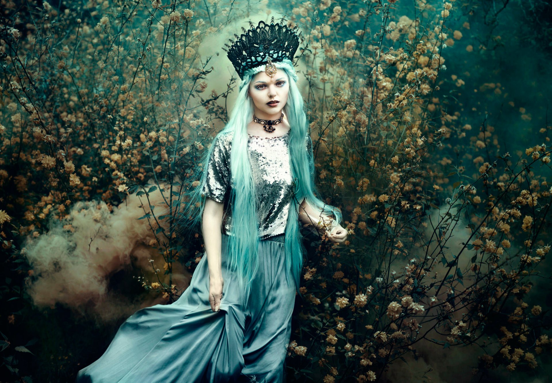 Bella Kotak con cabello turquesa contra un Jardín floreciente