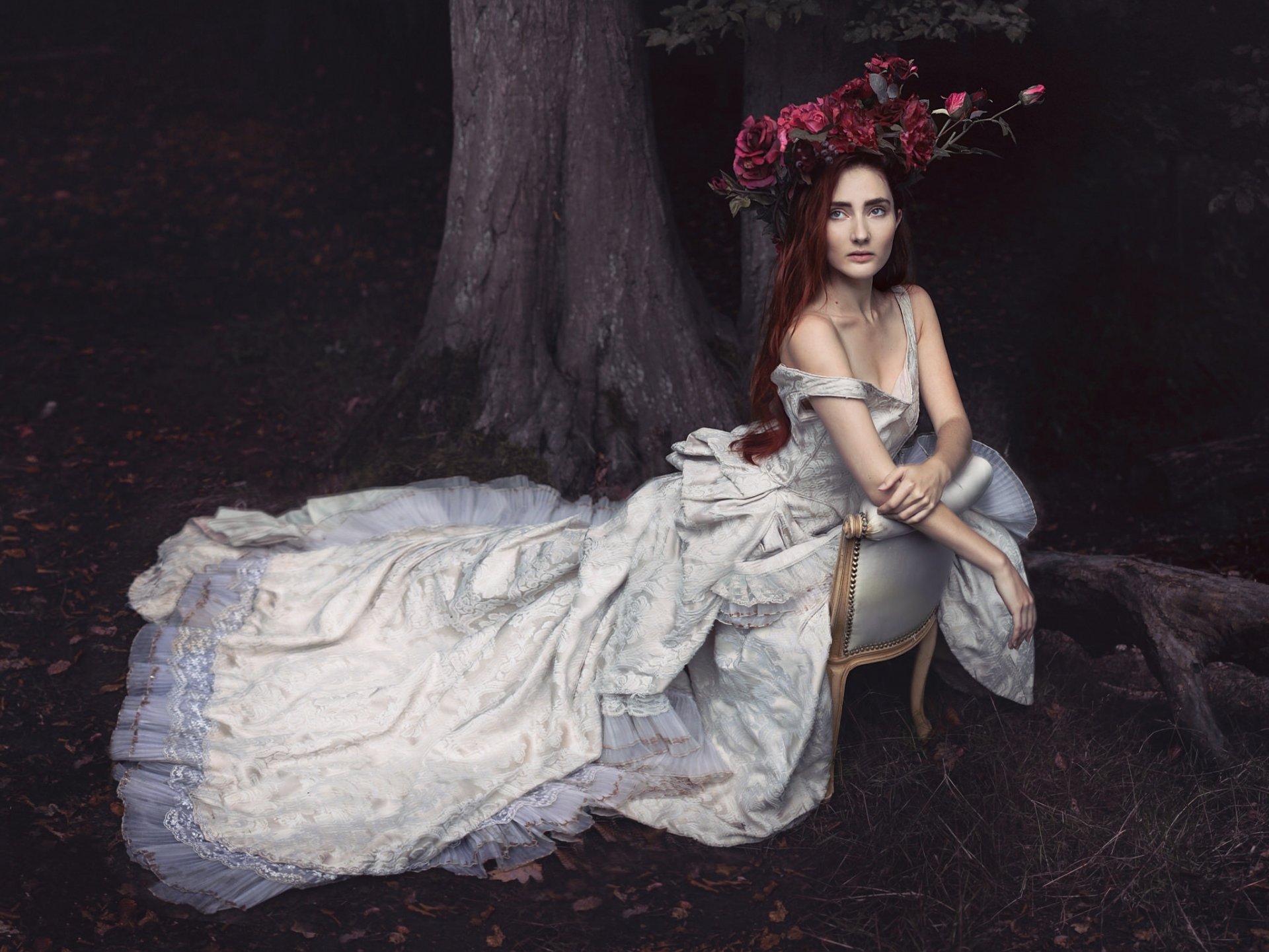 Un perro con una corona de flores en la cabeza se sienta en una canastaUn perro con una corona de flores en la cabeza se sienta en una canasta