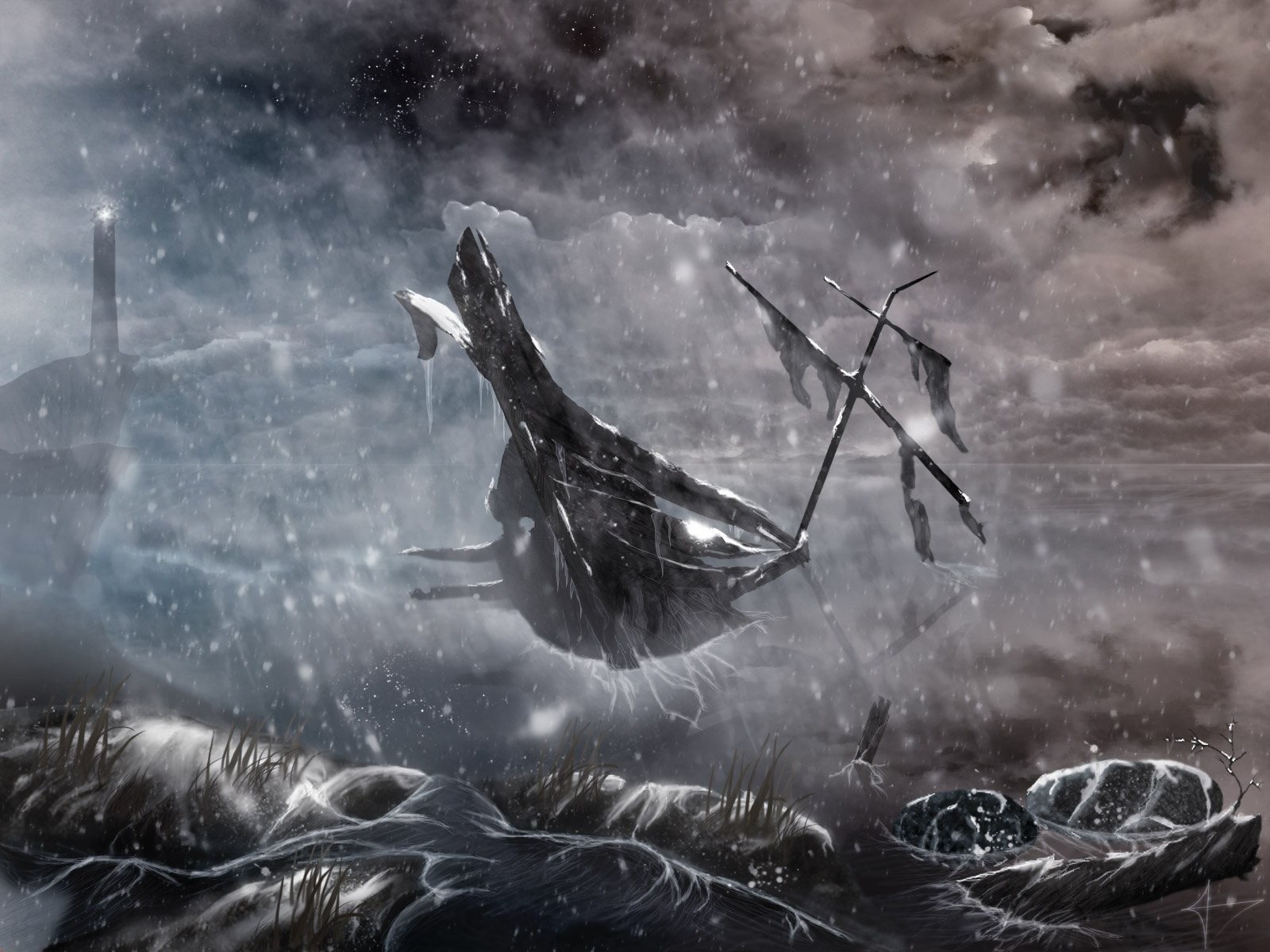 Enormes colosos en las cimas de las montañas en un paisaje brumosoEnormes colosos en las cimas de las montañas en un paisaje brumoso