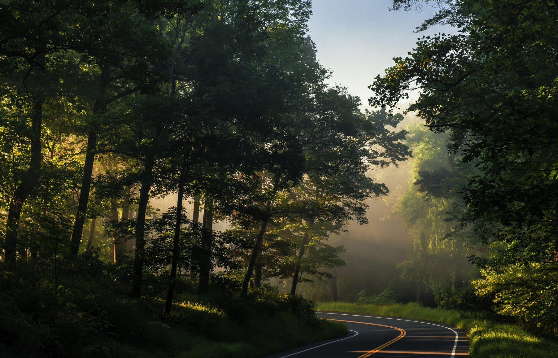 Un pintoresco camino en el bosque a través de la nieblaUn pintoresco camino en el bosque a través de la niebla