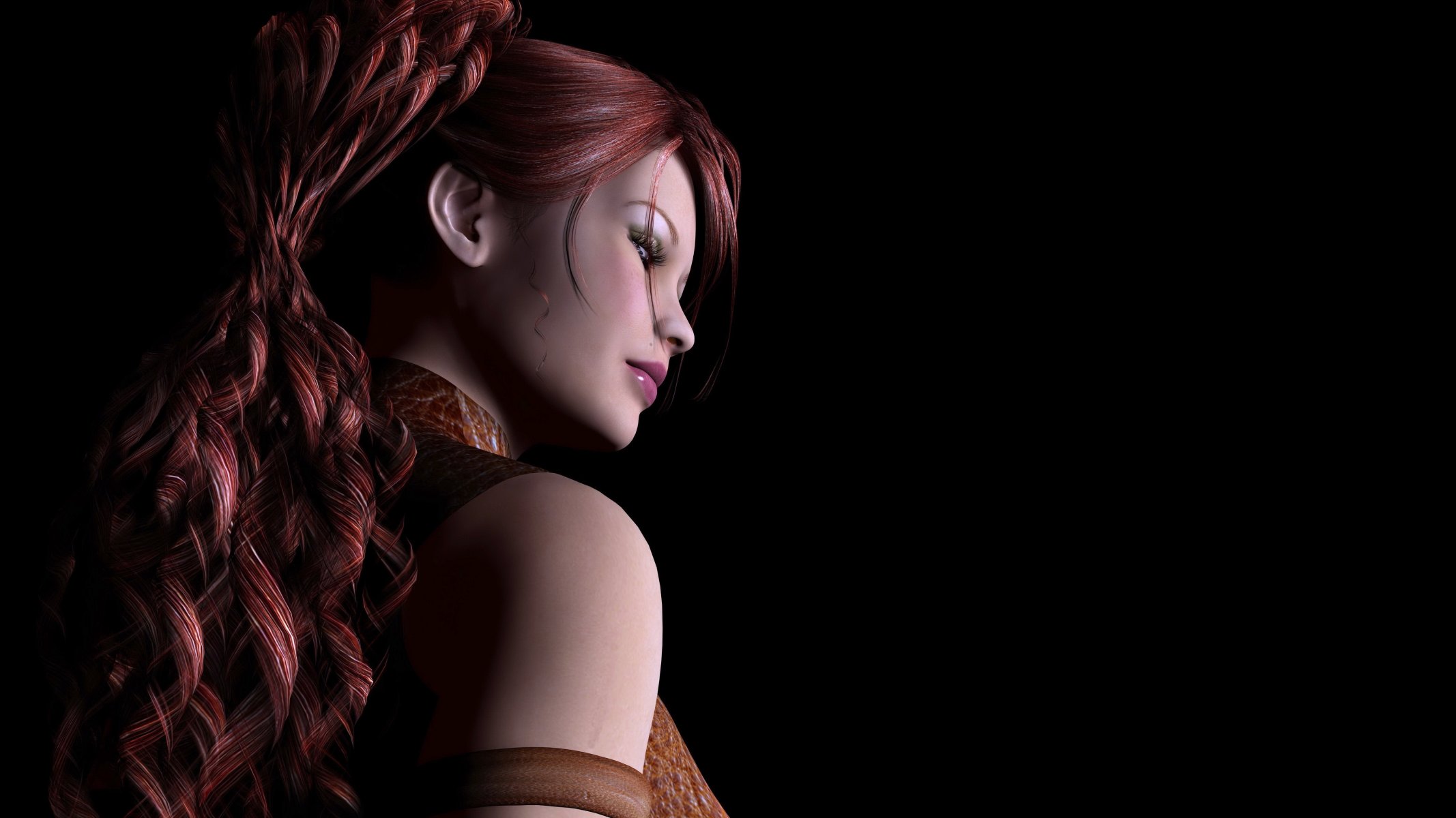 Una chica con el pelo largo y rojo de pie de perfil sobre un fondo negro