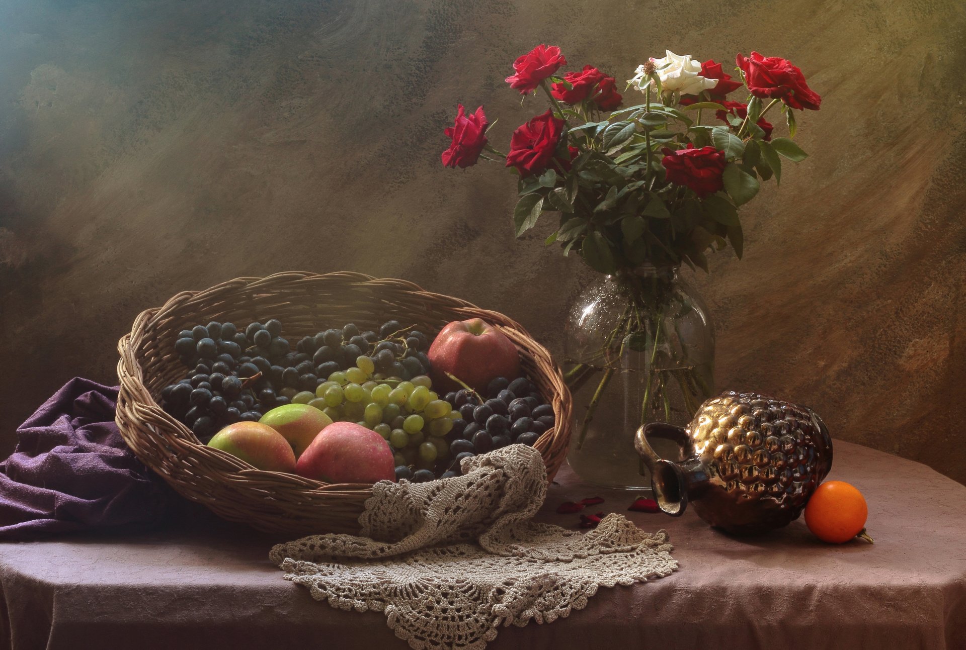 Naturaleza muerta con frutas en una cesta y un jarrón de rosasNaturaleza muerta con frutas en una cesta y un jarrón de rosas