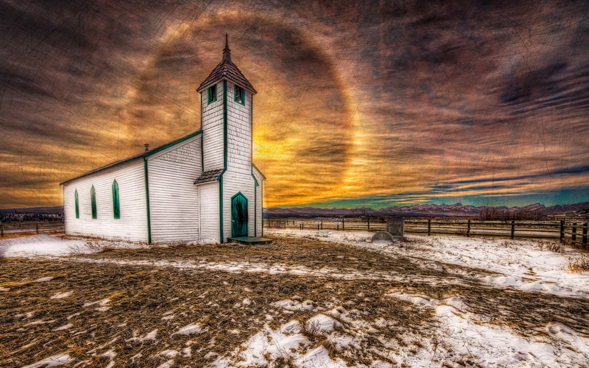 Templo en el fondo de la puesta de sol amarilla