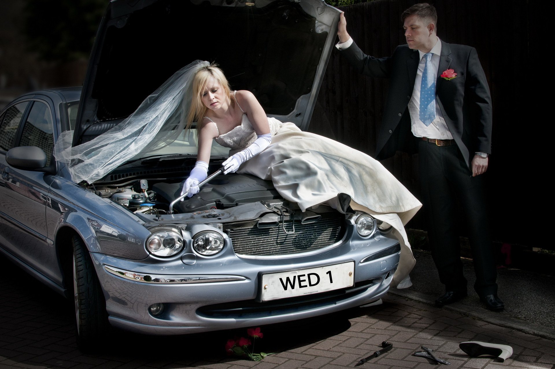 Chica con alas colgantes en un vestido de dama de honor sobre un fondo negro