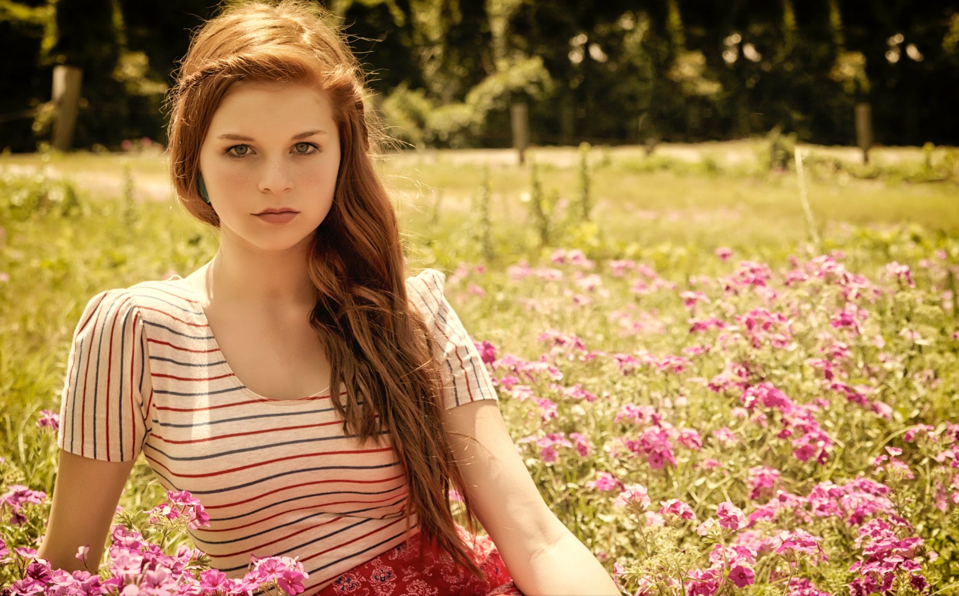 Chica de pelo largo en un clima soleado se sienta en un campo de flores