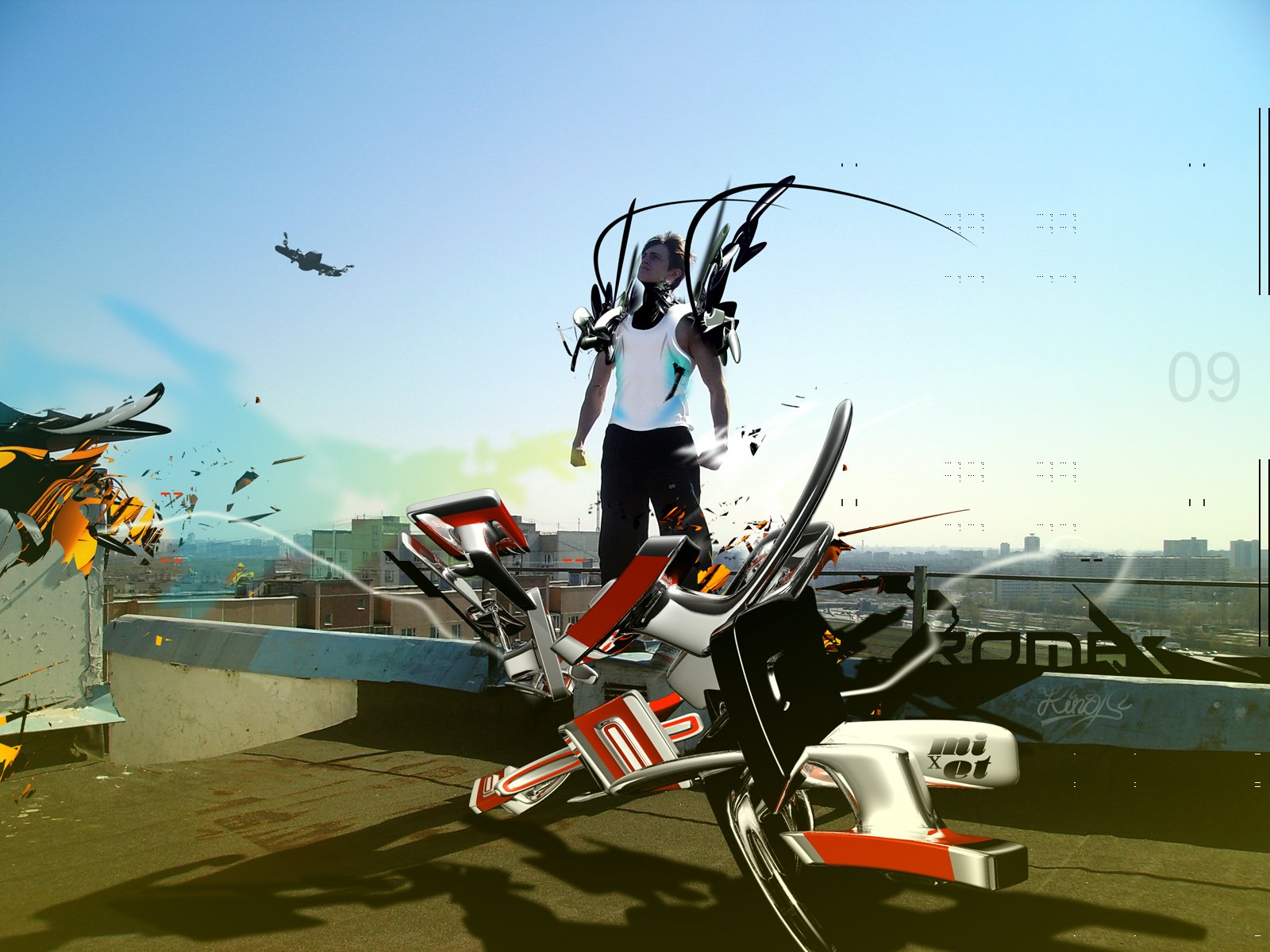 Imagen de dibujos animados futurista de un chico en la azoteaImagen de dibujos animados futurista de un chico en la azotea