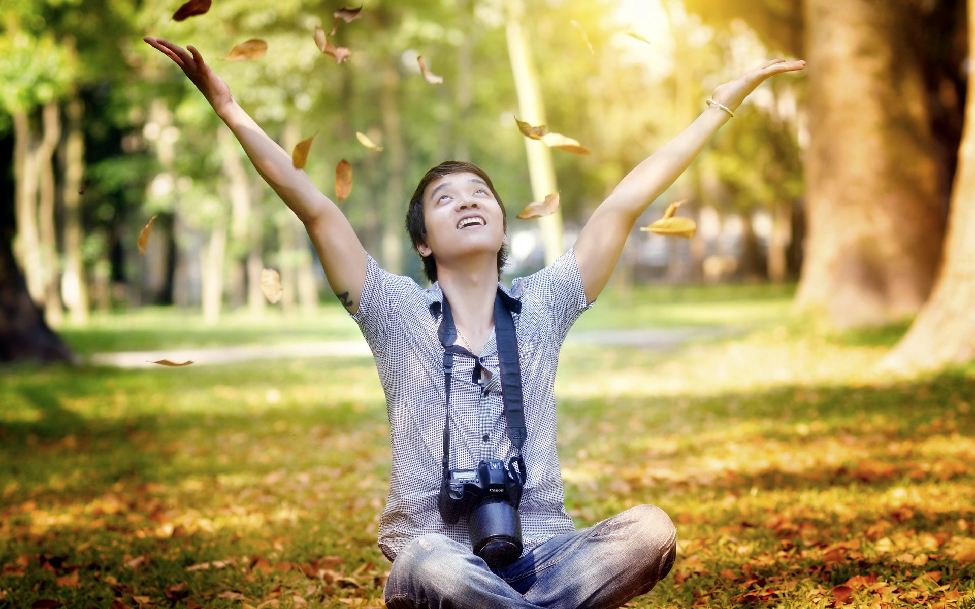 El chico con un par de fotos en el bosque de otoñoEl chico con un par de fotos en el bosque de otoño