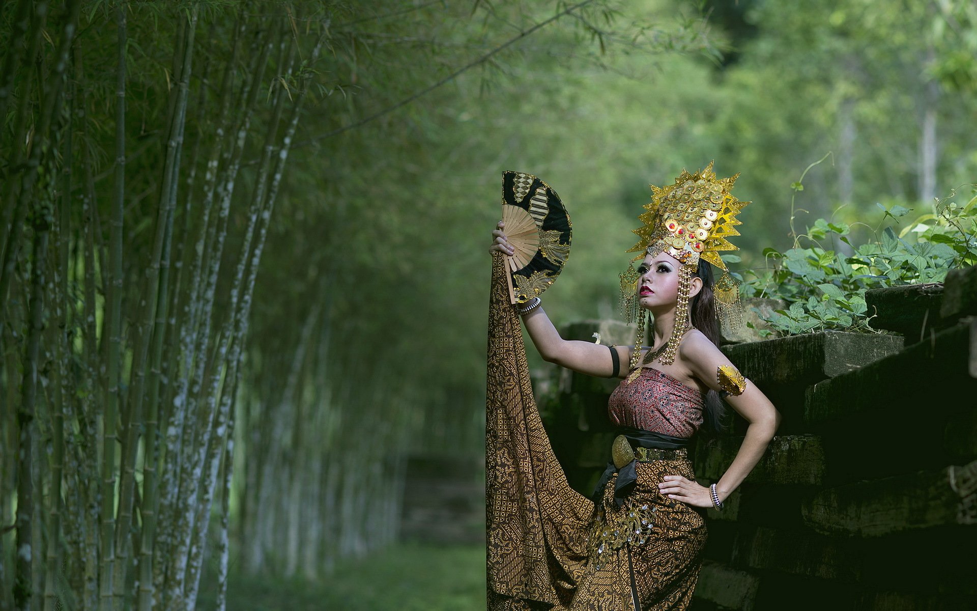 Hermosa chica con un Ventilador en el fondo de los árboles verdes