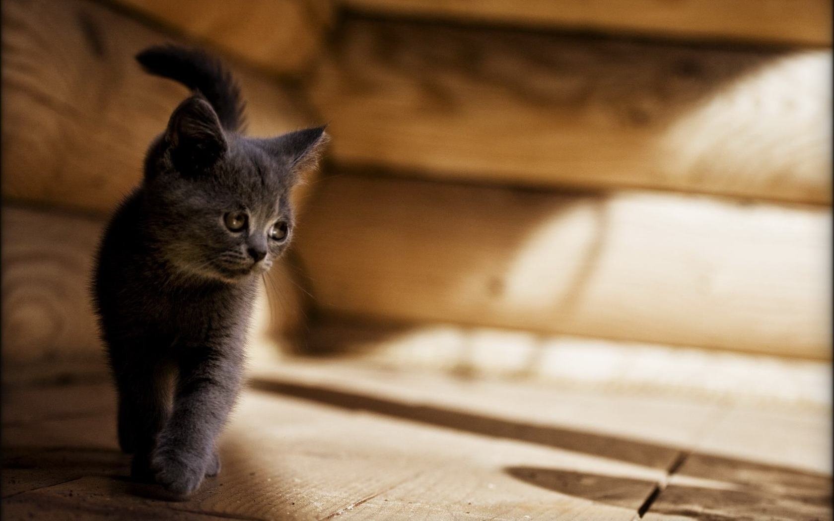 Un gato gris se esconde detrás de un árbol con hojas verdes