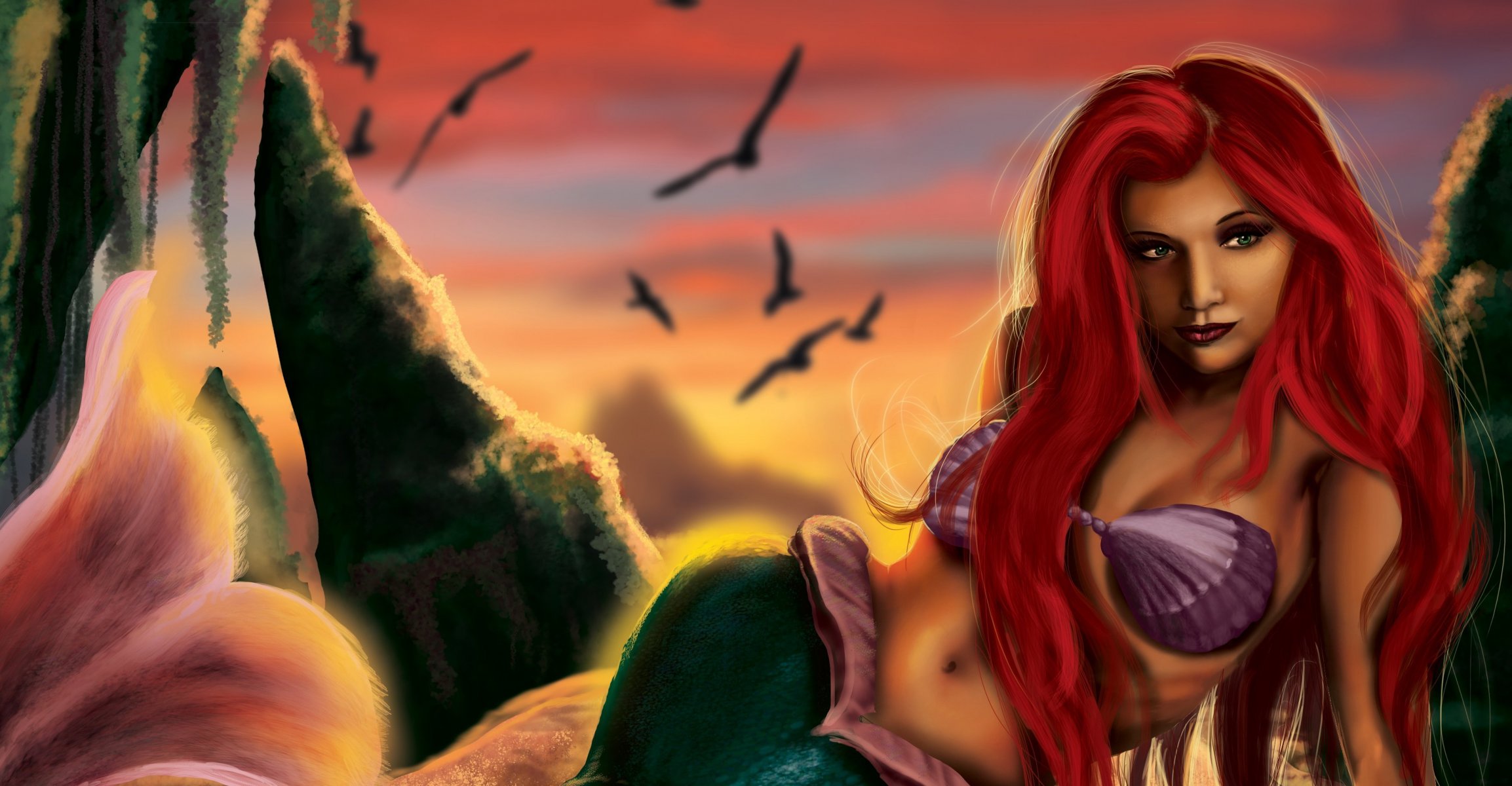 Sirena con el pelo rojo en una burbuja en el fondo del mar