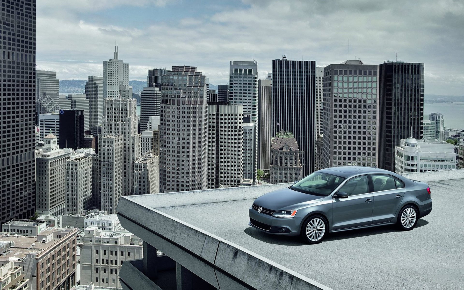 El coche de volkswagen en la ciudad en el techo de la casaEl coche de Volkswagen en la ciudad en el techo de la casa